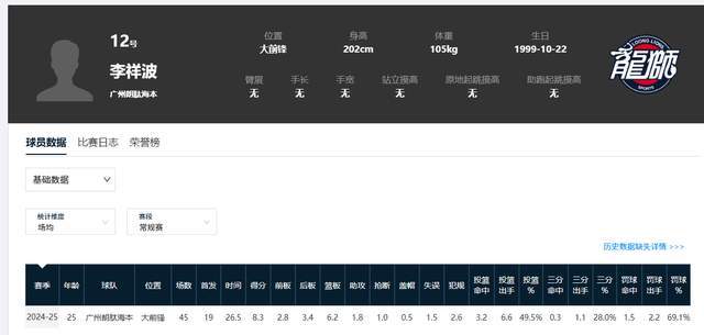 说起李祥波,很多球迷都是意难平。这位山东大汉,去年夏天,才通过选秀大会,被广州男篮带入了CBA的舞台。之前的时候,他一直都在NBL的安徽文一男篮打球,尽管在NBL的舞台上,李祥波展现出了强大的实力,但来到CBA的舞台之后,他在广州男篮阵中,并没有给人眼前一亮的感觉,上赛季打了45场,在场均26.5分钟时间里,只能拿到8.3分6.2篮板1.8助攻1抢断0.5盖帽,投篮命中率仅49.5%,三分球命中率28%,罚球命中率69.1%。